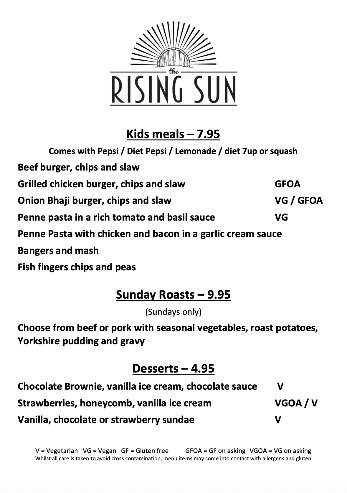 Bar open Monday - Sunday 12-11pm & Food served Mon - Sat 12-9pm, Sun 12-7pm