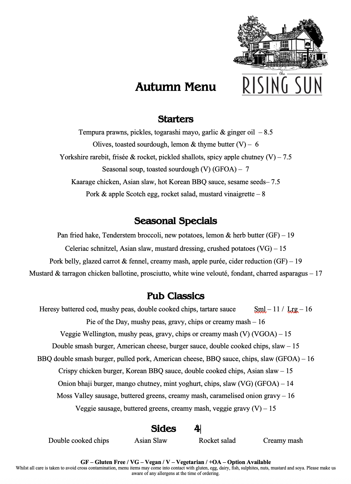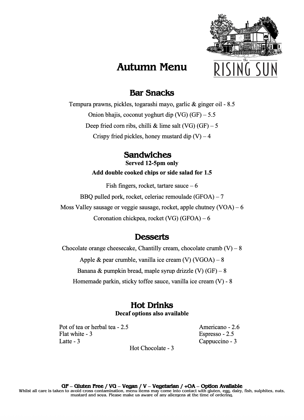Bar open Monday - Sunday 12-11pm & Food served Mon - Sat 12-9pm, Sun 12-7pm